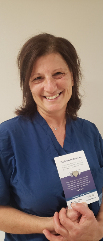Les patients avec qui Kiera travaille connaissent très bien l’importance de son rôle. L’un d’entre eux a récemment décerné à Kiera un Prix de gratitude pour la remercier des soins qu’elle a prodigués au cours d’une convalescence difficile.